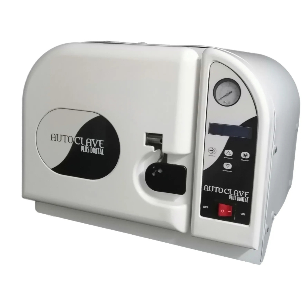 El autoclave Plus Digital a diferencia del Digital Tecnology, tiene el teclado al lado de la compuerta, trae pantalla donde se controla la temperatura, el tiempo de esterilización y secado. Accionando las válvulas de llenado de líquido, desfogue y resistencia. Su accionar es mostrado en el panel de control. Características:
