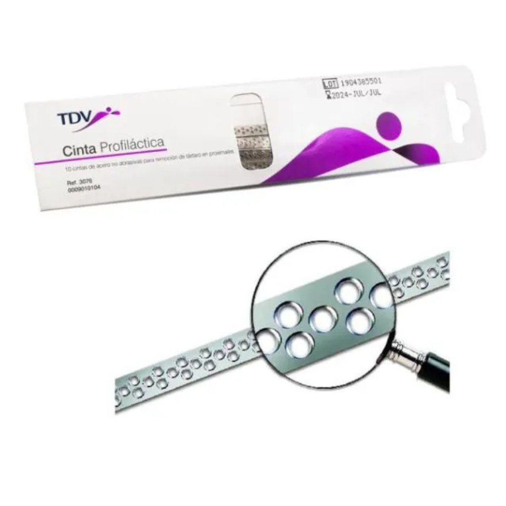 La Cinta Profiláctica x10 TDV es una herramienta de higiene interdental eficaz diseñada para la eliminación de placa dental y restos entre los dientes y a lo largo de la línea gingival, especialmente en zonas donde el cepillo dental no alcanza fácilmente. Su formato de cinta ancha y plana permite una limpieza profunda y suave, reduciendo la acumulación de biofilm y ayudando en la prevención de caries y enfermedades periodontales