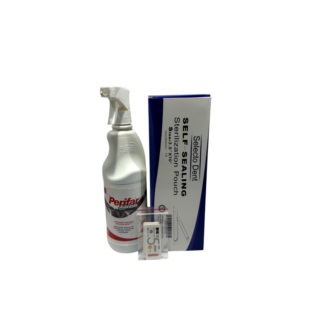 Por la compra de Perifar Autoclave, bolsas para esterilizar básico y tirillas indicadoras x12, obtén un descuento especial en un conjunto esencial para el mantenimiento del autoclave y el control seguro de los procesos de esterilización. Perifar Autoclave permite limpiar y restaurar la cámara del equipo, las bolsas de esterilización aseguran un adecuado empaque del instrumental y las tirillas indicadoras facilitan la verificación del proceso, garantizando protocolos de bioseguridad confiables en clínica odontológica.